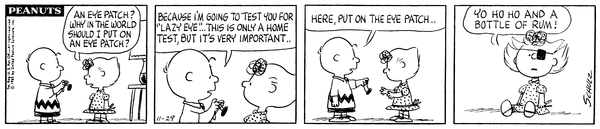 眼帯による治療の結果、視力は回復した設定になっています。役目を終えた眼帯は、なんとスヌーピーに譲渡され、彼はそれを着けて海賊ごっこを楽しみました。ここでもリサイクル精神(?)が発揮されています。