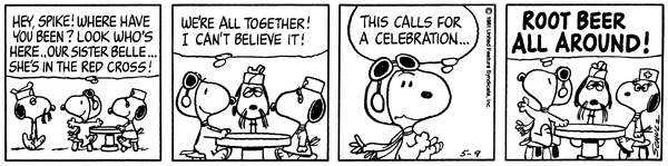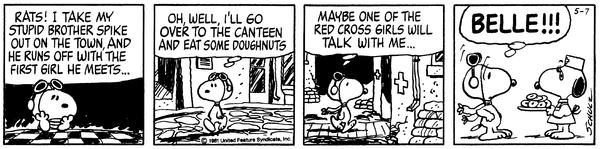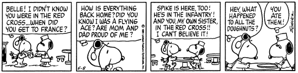 BELLE! I DIDN'T KNOW YOU WERE IN THE RED CROSS... WHEN DID YOU GET TO FRANCE? ベル! 君が赤十字にいたなんて知らなかったよ... いつフランスに来たんだい? HOW IS EVERYTHING BACK HOME? DID YOU KNOW I WAS A FLYING ACE? ARE MOM AND DAD PROUD OF ME? 田舎のみんなはどうしてる? 僕が撃墜王になったのは知ってるかい? パパとママは僕を自慢に思ってくれてるかな? SPIKE IS HERE, TOO! HE'S IN THE INFANTRY! AND YOU, MY OWN SISTER, IN THE RED CROSS!! I CAN'T BELIEVE IT! スパイクもここにいるんだ! 彼は歩兵隊にいるんだよ。そして君、僕の妹まで赤十字にいるなんて!! 信じられないよ! HEY, WHAT HAPPENED TO ALL THE DOUGHNUTS? ねえ、ドーナツは全部どうしちゃったの? YOU ATE THEM! あなたが食べたんでしょ!