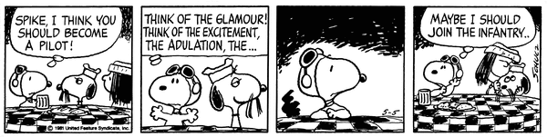 SPIKE, I THINK YOU SHOULD BECOME A PILOT! スパイク、兄さんはパイロットになるべきだと思うんだ! THINK OF THE GLAMOUR! THINK OF THE EXCITEMENT, THE ADULATION, THE... 華やかさを考えてごらんよ! 興奮や、賞賛や、それに... MAYBE I SHOULD JOIN THE INFANTRY... やっぱり、僕が歩兵隊に入るべきかな...