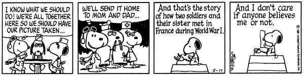 I KNOW WHAT WE SHOULD DO! WE'RE ALL TOGETHER HERE SO WE SHOULD HAVE OUR PICTURE TAKEN... どうすればいいか分かったぞ! せっかく全員揃っているんだから、記念写真を撮るべきだ... WE'LL SEND IT HOME TO MOM AND DAD... これを田舎のパパとママに送ってあげよう... AND THAT'S THE STORY OF HOW TWO SOLDIERS AND THEIR SISTER MET IN FRANCE DURING WORLD WAR I. 以上が、第一次世界大戦中のフランスで、二人の兵士とその妹が出会った物語である。 AND I DON'T CARE IF ANYONE BELIEVES ME OR NOT. 誰が僕を信じようと信じまいと、そんなことは知ったこっちゃない。