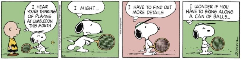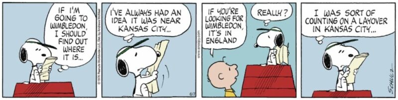 IF I'M GOING TO WIMBLEDON, I SHOULD FIND OUT WHERE IT IS... ウィンブルドンに行くなら、それがどこにあるのか調べなきゃな... I'VE ALWAYS HAD AN IDEA IT WAS NEAR KANSAS CITY... ずっとカンザスシティの近くだと思ってたんだが... IF YOU'RE LOOKING FOR WIMBLEDON, IT'S IN ENGLAND. チャーリー・ブラウン: ウィンブルドンを探しているなら、それはイギリスにあるよ。 REALLY? 本当に? I WAS SORT OF COUNTING ON A LAYOVER IN KANSAS CITY... カンザスシティでの乗り継ぎをあてにしてたんだけどな...