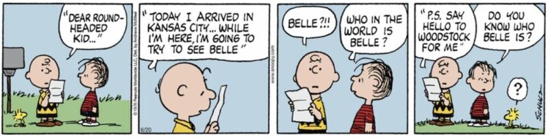"DEAR ROUND-HEADED KID..." 「親愛なる丸い頭の子へ...」 "TODAY I ARRIVED IN KANSAS CITY... WHILE I'M HERE, I'M GOING TO TRY TO SEE BELLE" 「今日、カンザスシティに到着したよ... ここにいる間に、ベルに会ってみようと思うんだ」 BELLE?!! LINUS: WHO IN THE WORLD IS BELLE? ベル?!! ライナス: 一体全体、ベルって誰のことだい? "P.S. SAY HELLO TO WOODSTOCK FOR ME" 「追伸:ウッドストックによろしく」 DO YOU KNOW WHO BELLE IS? (ウッドストックに)君はベルが誰だか知ってるかい?