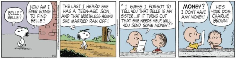ANOTHER LETTER FROM SNOOPY? CHARLIE BROWN: "DEAR ROUND-HEADED KID... GUESS WHAT HAPPENED!" またスヌーピーからの手紙? チャーリー・ブラウン: 「親愛なる丸い頭の子へ... 何が起きたか当ててごらん!」 "I FOUND MY SISTER BELLE... AND WHAT A REUNION WE'RE HAVING! BELLE IS JUST AS BEAUTIFUL AS EVER" 「妹のベルを見つけたんだ... なんて素晴らしい再会なんだろう! ベルは相変わらず美しいよ」 "UNFORTUNATELY, I CAN'T SAY MUCH FOR HER TEEN-AGE SON" 「あいにく、彼女の10代の息子については、あまり褒めたことは言えないけどね」