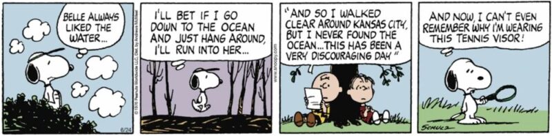 BELLE ALWAYS LIKED THE WATER... ベルはいつも水辺が好きだったな... I'LL BET IF I GO DOWN TO THE OCEAN AND JUST HANG AROUND, I'LL RUN INTO HER... 海へ行ってぶらぶらしていれば、きっと彼女にばったり会えるはずだ... "AND SO I WALKED CLEAR AROUND KANSAS CITY, BUT I NEVER FOUND THE OCEAN... THIS HAS BEEN A VERY DISCOURAGING DAY" 「そういうわけでカンザスシティを隅々まで歩き回ったんだけど、結局海は見つからなかった... 今日はとてもがっかりな一日だったよ」 AND NOW, I CAN'T EVEN REMEMBER WHY I'M WEARING THIS TENNIS VISOR! それに今はもう、自分がどうしてこのテニスサンバイザーを被っているのかさえ思い出せないよ!
