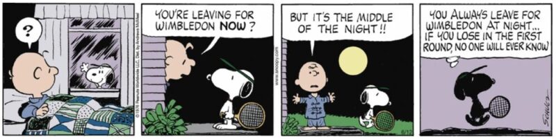 YOU'RE LEAVING FOR WIMBLEDON NOW? 今からウィンブルドンへ出発するのかい? BUT IT'S THE MIDDLE OF THE NIGHT!! でも、今は真夜中だよ!! YOU ALWAYS LEAVE FOR WIMBLEDON AT NIGHT... IF YOU LOSE IN THE FIRST ROUND, NO ONE WILL EVER KNOW ウィンブルドンへはいつも夜に出発するのさ... もし一回戦で負けても、誰にも知られずに済むからね。