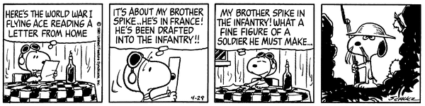 HERE'S THE WORLD WAR I FLYING ACE READING A LETTER FROM HOME こちらは、故郷からの手紙を読んでいる第一次世界大戦の撃墜王だ。 IT'S ABOUT MY BROTHER SPIKE... HE'S IN FRANCE! HE'S BEEN DRAFTED INTO THE INFANTRY!! 兄のスパイクについて書いてある... 彼はフランスにいるんだ! 歩兵隊に徴兵されたんだって!! MY BROTHER SPIKE IN THE INFANTRY! WHAT A FINE FIGURE OF A SOLDIER HE MUST MAKE... 兄のスパイクが歩兵隊に! きっと立派な兵士の姿をしているに違いない...