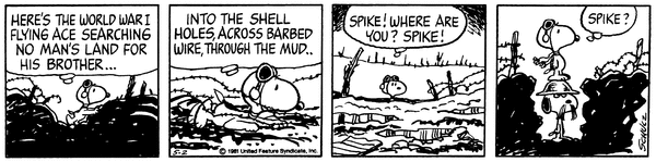 HERE'S THE WORLD WAR I FLYING ACE SEARCHING NO MAN'S LAND FOR HIS BROTHER... こちらは、無人地帯で兄を探している第一次世界大戦の撃墜王だ... INTO THE SHELL HOLES, ACROSS BARBED WIRE, THROUGH THE MUD... 砲弾の跡に潜り込み、有刺鉄線を越え、泥の中を突き進む... SPIKE! WHERE ARE YOU? SPIKE! スパイク! どこにいるんだ? スパイク! SPIKE? スパイク?