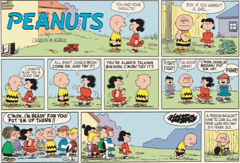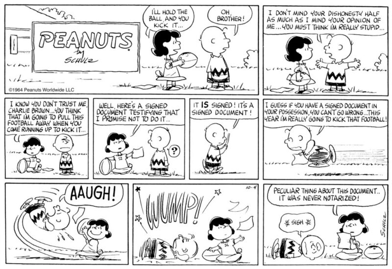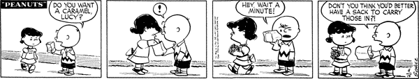 この話は、ルーシーのずうずうしさと、それに対するチャーリー・ブラウンの戸惑いや諦めが描かれたピーナッツらしいやり取りですね。