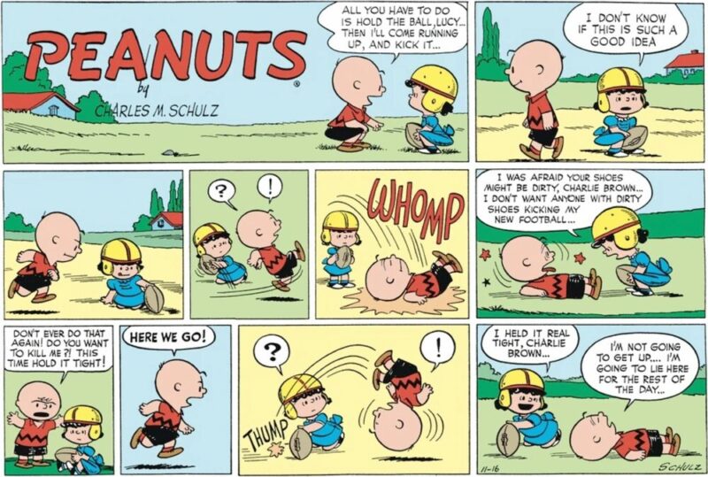 毎年秋になると繰り返される、あの光景。チャーリー・ブラウンがボールを蹴ろうとした瞬間、ルーシーがサッとボールを引く。ドスン!と背中から落ちるチャーリー・ブラウン。