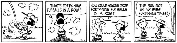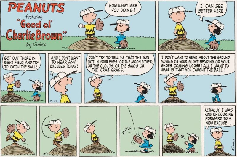 チャーリー・ブラウン率いる弱小野球チームで、ルーシーはライト(右翼手)を守っています。野球の腕前? お世辞にも上手とは言えません。しかし、彼女がフライを落球した時の「言い訳」のクリエイティビティは、メジャーリーグ級です。
