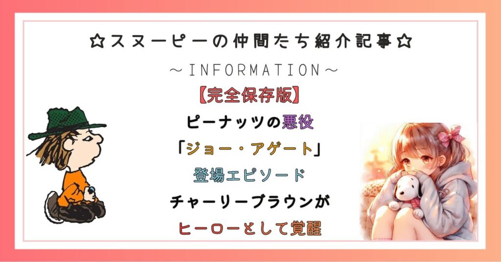 いかがでしたでしょうか?「ピーナッツの悪役「ジョー・アゲート」の登場エピソード」をご覧いただき、彼の魅力(?)を再発見していただけたなら嬉しいです。