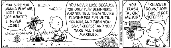 言葉巧みにビー玉遊びに誘い込み、自分が勝つたびにこう宣言するんです。 「これは『真剣勝負(for keeps)』だ!」