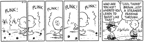映画では、少年ジョーイが去りゆくヒーロー(シェーン)に向かって「シェーン!カムバック!」と叫びますが、ここではリランがチャーリー・ブラウンをそのヒーローに重ね合わせて叫んでいます。