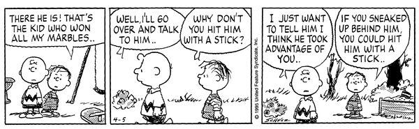 リランの「棒で叩けばいい」という子供らしい(?)過激な解決策に対し、あくまでお話合いで解決しようとするチャーリー・ブラウンの対比が面白いですよね!