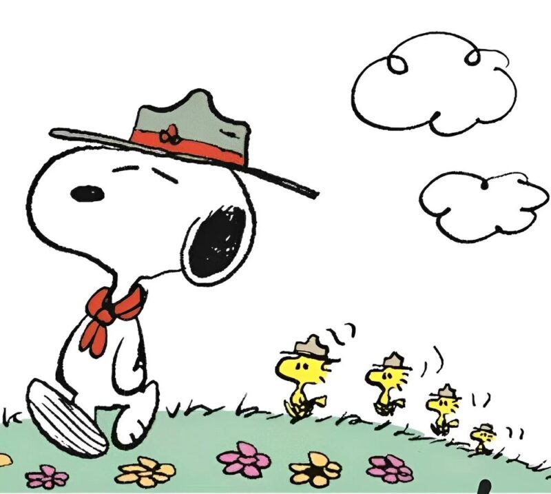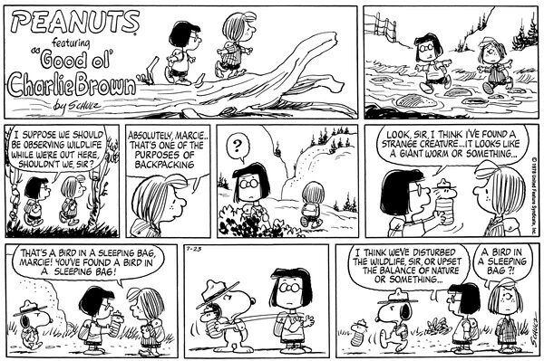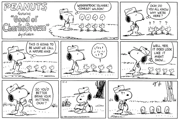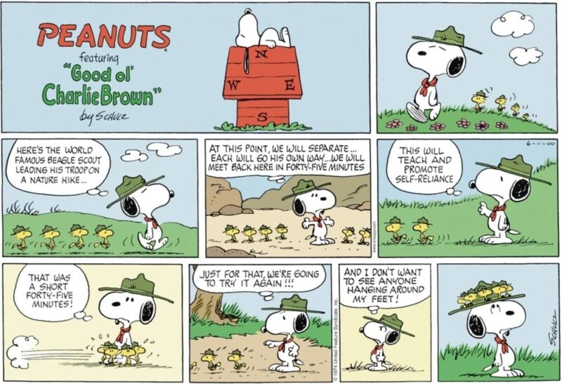 スヌーピー "HERE'S THE WORLD FAMOUS BEAGLE SCOUT LEADING HIS TROOP ON A NATURE HIKE..." 「さあ、世界的に有名なビーグル・スカウトが、隊を率いて自然観察ハイキングに出発するぞ…」