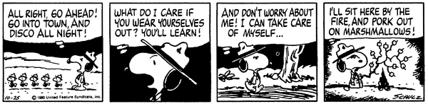 スヌーピー (ビーグル・スカウト) "ALL RIGHT, GO AHEAD! GO INTO TOWN, AND DISCO ALL NIGHT!" 「よし、行ってしまえ! 町に行って、一晩中ディスコで踊ってこい!」