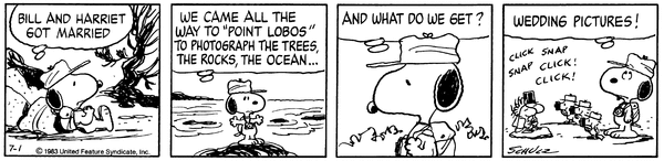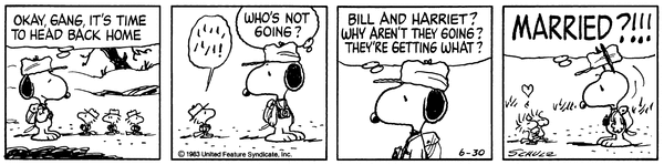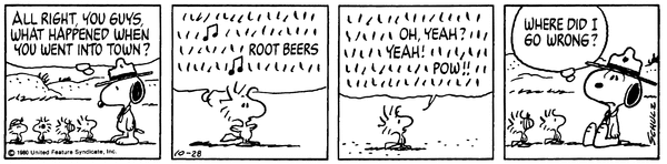 スヌーピー (ビーグル・スカウト) "SO YOU GUYS ALL WENT INTO TOWN, AND GOT IN A BRAWL...WHAT ABOUT HARRIET? WHERE'S HARRIET?" 「それで、お前たちはみんな町に行って、乱闘騒ぎを起こしたのか…ハリエットはどうした? ハリエットはどこだ?」
