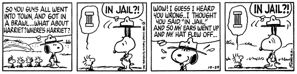 スヌーピー "WOW! I GUESS I HEARD YOU WRONG...I THOUGHT YOU SAID, "IN JAIL," AND SO MY EARS WENT UP AND MY HAT FLEW OFF..." 「うわ! 聞き間違いかと思ったぞ…お前が「刑務所に」と言ったから、ぼくの耳がピンと立って帽子が飛んでしまったのかと…」