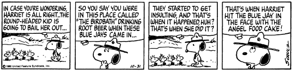 スヌーピー "THAT'S WHEN HARRIET HIT THE BLUE JAY IN THE FACE WITH THE ANGEL FOOD CAKE!" 「その時、ハリエットがアオカケスの顔をエンゼル・フード・ケーキで殴りつけたんだな!」