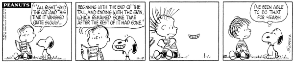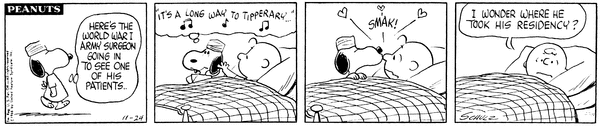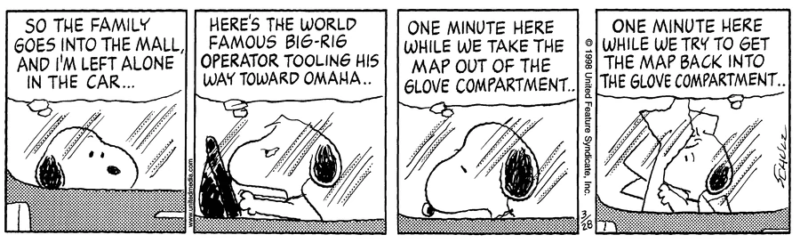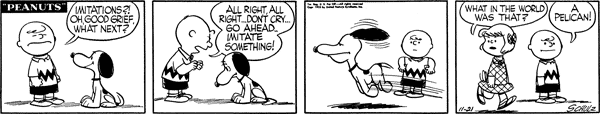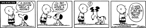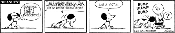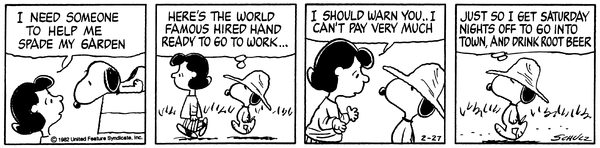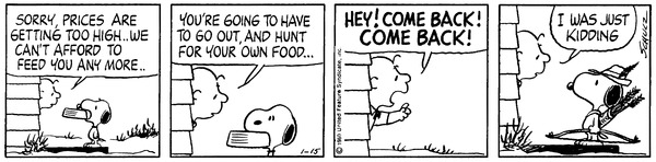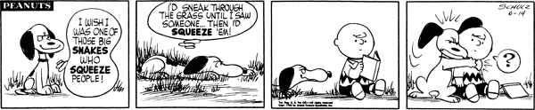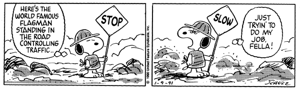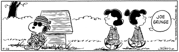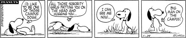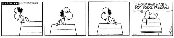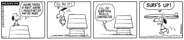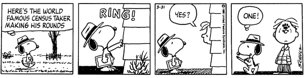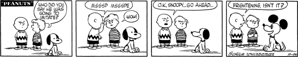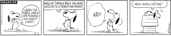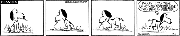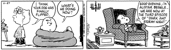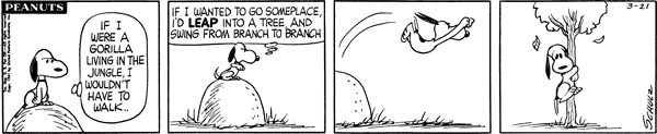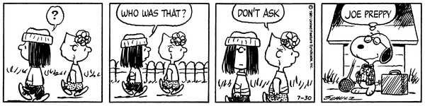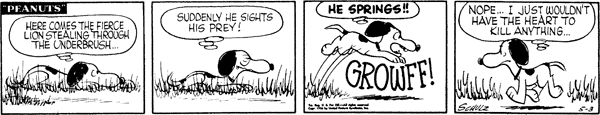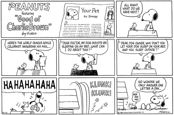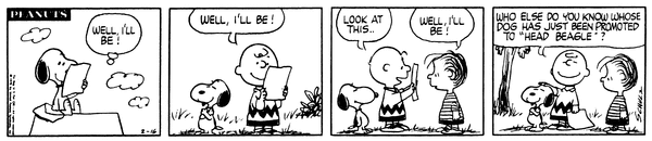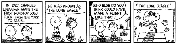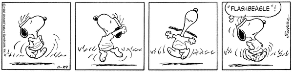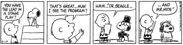 1980年1月15日 弓矢のハンター (A bow and arrow hunter)1980年3月19日 ドクター・ビーグル&ミスター・ハイド (Dr. Beagle and Mr. Hyde)1980年3月28日 ガラガラヘビ (A rattlesnake)1980年3月31日 世界的に有名な国勢調査員 (World Famous Census Taker)1980年5月6日 ジョン・マッケンロー (John McEnroe)1980年5月7日 トレーシー・オースティン (Tracy Austin)1980年5月8日 ジョン・ニューカム (John Newcombe)1980年10月12日 世界的に有名な悩み相談員 (World Famous Advice Columnist)1981年6月12日 画家 (A painter)1981年7月30日 ジョー・プレッピー (Joe Preppy)1980年10月12日 世界的に有名な悩み相談員 (World Famous Advice Columnist)1982年7月12日 世界的に有名な外科医 (The World Famous Surgeon)1982年10月25日 ジョー・サンドバガー (Joe Sandbagger)1983年11月27日 戦車レースのドライバー (A chariot race driver)1983年11月29日 フラッシュビーグル (Flashbeagle)1985年2月10日 赤毛の女の子 (The Little Red-Haired Girl)1985年8月7日 パンカー (A “punker”)1985年8月18日 世界的に有名な探検家 (The World Famous Explorer)1985年10月21日 ローン・ビーグル(孤独なビーグル) (The Lone Beagle)1986年9月15日 世界的に有名なエージェント (The World Famous Agent)1988年8月21日 類人猿 (An ape)1989年6月27日 アリスター・ビーグル (Alistair Beagle)1989年12月18日 サンタクロース (Santa Claus)1990年10月2日 10月の獣 (An “October beast”)1991年1月9日 世界的に有名な信号係 (The World Famous Flagman)1991年6月17日 ビーバー (A beaver)1991年10月10日 熟練したサービス技術者 (A trained service technician)1992年6月8日 エース航空のパイロット (“Ace Airlines” pilot)1993年4月26日 ジョー・グランジ (Joe Grunge)1994年6月6日 世界的に有名なG.I. (World Famous G.I.)1994年10月23日 世界的に有名なホッケーコーチ (World Famous Hockey Coach)1995年8月30日 ジョー・ブラックジャック (Joe Blackjack)1996年2月27日 ブラックビーグル(海賊) (Blackbeagle)1997年1月5日 独立戦争の愛国者 (A Revolutionary War Patriot)1998年3月28日 世界的に有名な大型トラック運転手 (World-Famous Big-Rig Operator)1998年5月21日 スコット・フィッツジェラルドの英雄 (The Scott Fitzgerald Hero)1999年8月26日 世界的に有名な整形外科医 (World Famous Orthopedic Surgeon)