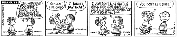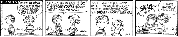 1961年の初登場時、彼女をみんなに紹介したのはライナスでした。彼女はすぐにその「おしゃべり」な性格を発揮し、またたく間に読者の心を(良くも悪くも)掴みました。彼女は1960年代を通じてコミックの主要メンバーとして活躍しましたが、70年代に入ると徐々に出番が減少。1985年以降はコミックの第一線から退くことになります。