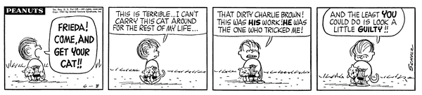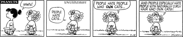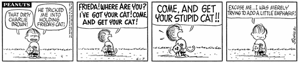登場期間こそ短かったけれど、フリーダの「生まれつきのカールヘア!」っていう口癖と、彼女の腕の中でぐにゃっとなっている猫ファーロンの姿は、『ピーナッツ』ファンの心の中に、強烈なインパクトを残している、忘れられない名(迷?)コンビなんです!