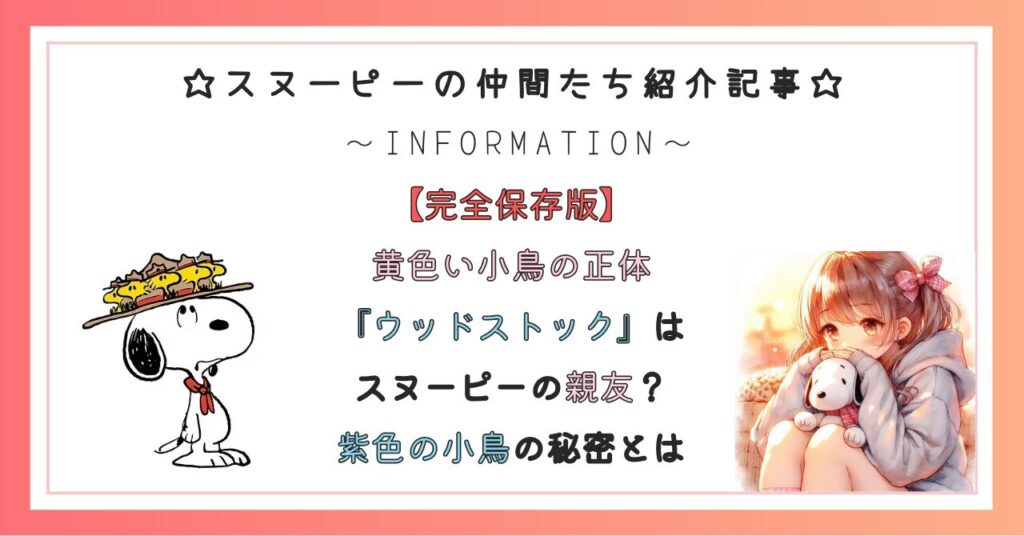 この記事では、ウッドストックの知られざる魅力と秘密を徹底的に解説します。ウッドストックの名前の由来から、性別、特徴、スヌーピーとの出会い、そしてファン必見の最新情報まで、ウッドストックのすべてを網羅し、紹介します!