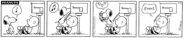 (スヌーピーが鼻歌を歌いながら郵便受けを覗くが、中身は空っぽ)