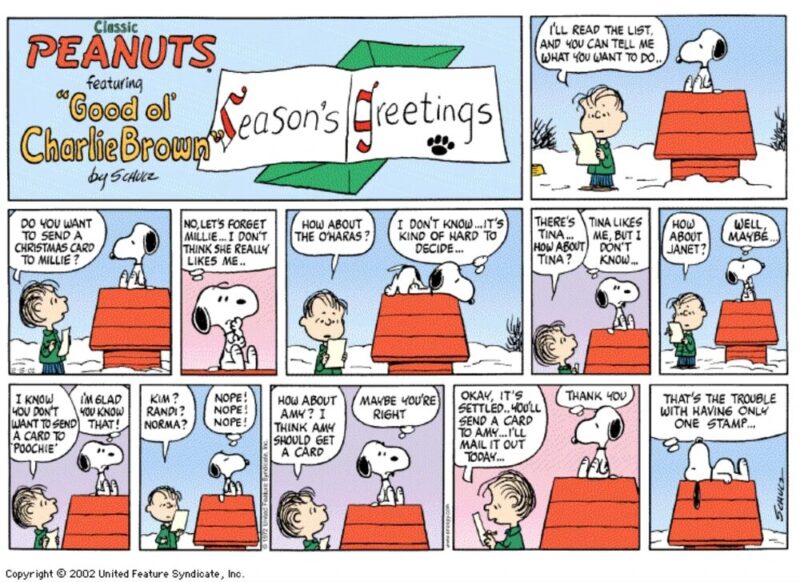 日曜版のストリップにて、スヌーピーがエイミーへクリスマスカードを送る描写。スヌーピーの筆まめな一面に、エイミーが欠かせない存在だったことが分かります。