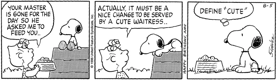 スヌーピー「エイミー、ジル、ベティ、マージ、ケイ、フリーダ、アナベル、スー、エヴァ、ジュディ、ルース……」