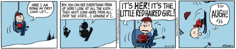 HERE I AM RIDING MY FIRST CHAIR LIFT... さあ、生まれて初めてのスキーリフトに乗っているぞ……。 BOY, YOU CAN SEE EVERYTHING FROM UP HERE! LOOK AT ALL THE KIDS... THEY MUST COME HERE FROM ALL OVER THE STATE... I WONDER IF I.. わあ、ここからだと何でも見えるな! 子供たちをみんな見てごらんよ……。きっと州中からここに来ているんだ……。もしかして……。 IT'S HER! IT'S THE LITTLE RED-HAIRED GIRL! 彼女だ! 「赤毛の女の子」だ! AUGH! ああああ! (驚きやショックで椅子から落ちそうになる時の叫び声)