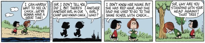 I CAN HARDLY WAIT TO SEE OL' CHUCK... WE'RE GONNA HAVE A GREAT TIME! 懐かしのチャックに会うのが待ちきれないよ……最高の時間を過ごすんだ! SIR, I DIDN'T TELL YOU, DID I, BUT THERE'S ANOTHER GIRL IN OUR CAMP WHO KNOWS CHUCK.. 先輩、お伝えしていませんでしたっけ。私たちのキャンプに、チャックを知っている女の子がもう一人いるんですよ……。 ANOTHER GIRL? WHO? もう一人の女の子? 誰だい? I DON'T KNOW HER NAME, BUT SHE HAS RED HAIR, AND SHE SAID SHE USED TO GO TO THE SAME SCHOOL WITH CHUCK... 名前は知らないんですけど、赤毛の子で、昔チャックと同じ学校に通っていたって言っていました……。 SIR, WHY ARE YOU STANDING WITH YOUR HEAD AGAINST THAT TREE? 先輩、どうして木に頭を押し付けて立っているんですか?