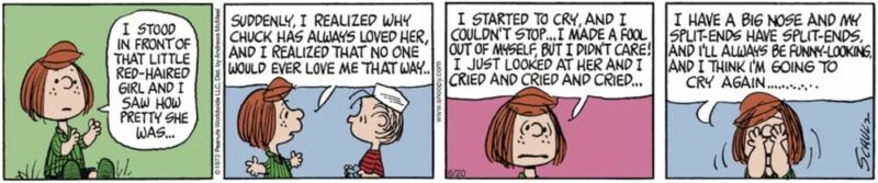 I STOOD IN FRONT OF THAT LITTLE RED-HAIRED GIRL AND I SAW HOW PRETTY SHE WAS... あの「赤毛の女の子」の前に立って、彼女がどれほどきれいか分かったわ……。 SUDDENLY, I REALIZED WHY CHUCK HAS ALWAYS LOVED HER, AND I REALIZED THAT NO ONE WOULD EVER LOVE ME THAT WAY.. その時、なぜチャック(チャーリー・ブラウン)がずっと彼女に恋をしていたのか突然理解したの。そして、誰も私のことをあんな風には愛してくれないんだってことも……。 I STARTED TO CRY, AND I COULDN'T STOP... I MADE A FOOL OUT OF MYSELF, BUT I DIDN'T CARE! I JUST LOOKED AT HER AND I CRIED AND CRIED AND CRIED... 涙が出てきて、止まらなくなっちゃった……。バカみたいな姿を見せたけど、そんなのどうでもよかった! ただ彼女を見つめて、泣いて、泣いて、泣き続けたわ……。 I HAVE A BIG NOSE AND MY SPLIT-ENDS HAVE SPLIT-ENDS, AND I'LL ALWAYS BE FUNNY-LOOKING, AND I THINK I'M GOING TO CRY AGAIN.......... 私は鼻が大きいし、枝毛の先まで枝毛になってるし、いつまでも冴えない見た目のままだわ。また涙が出てきそう……。