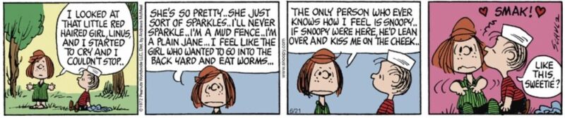 I LOOKED AT THAT LITTLE RED-HAIRED GIRL, LINUS, AND I STARTED TO CRY AND I COULDN'T STOP.. ライナス、あの「赤毛の女の子」を見たとき、涙が出てきて止まらなくなっちゃったの……。 SHE'S SO PRETTY... SHE JUST SORT OF SPARKLES... I'LL NEVER SPARKLE.. I'M A MUD FENCE... I'M A PLAIN JANE... I FEEL LIKE THE GIRL WHO WANTED TO GO INTO THE BACK YARD AND EAT WORMS... 彼女はとってもきれいで……なんだかキラキラ輝いていて……。私は一生あんな風に輝けないわ。私は「泥の垣根」みたいに不細工で……どこにでもいる平凡な女の子……。「裏庭に行ってミミズでも食べていたい」って気分よ……。 THE ONLY PERSON WHO EVER KNOWS HOW I FEEL IS SNOOPY.. IF SNOOPY WERE HERE, HE'D LEAN OVER AND KISS ME ON THE CHEEK.. 私の気持ちをわかってくれるのはスヌーピーだけだわ。もしスヌーピーがここにいたら、身を乗り出して私の頬にキスしてくれるのに……。 LIKE THIS, SWEETIE? こんな風にかい、お嬢さん? SMAK! チュッ!