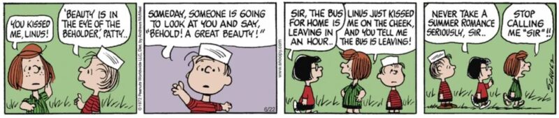 YOU KISSED ME, LINUS! 私にキスしたわね、ライナス! 'BEAUTY IS IN THE EYE OF THE BEHOLDER,' PATTY.. 「美は見る人の目の中にある」んだよ、パティ……。 SOMEDAY, SOMEONE IS GOING TO LOOK AT YOU AND SAY, "BEHOLD! A GREAT BEAUTY!" いつか、誰かが君を見てこう言うはずさ。「見よ! 類まれなる美人がここにいる!」ってね。 SIR, THE BUS FOR HOME IS LEAVING IN AN HOUR.. 先輩、帰りのバスが1時間後に出発します……。 LINUS JUST KISSED ME ON THE CHEEK, AND YOU TELL ME THE BUS IS LEAVING! ライナスが私の頬にキスしたっていうのに、あんたはバスが出るなんて言ってるのかい! NEVER TAKE A SUMMER ROMANCE SERIOUSLY, SIR.. 夏の恋を本気にしちゃいけませんよ、閣下……。 STOP CALLING ME "SIR"!! あたいを「閣下」って呼ぶのはおやめ!!