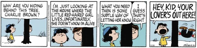 WHY ARE YOU HIDING BEHIND THIS TREE, CHARLIE BROWN? どうしてこの木の後に隠れているんだい、チャーリー・ブラウン? I'M JUST LOOKING AT THE HOUSE WHERE THE LITTLE RED-HAIRED GIRL LIVES.. UNFORTUNATELY, SHE DOESN'T KNOW I'M ALIVE あの「赤毛の女の子」が住んでいる家をただ見ているだけさ……。あいにく、彼女は僕がこの世に存在していること(生きていること)すら知らないんだけどね。 WHAT YOU NEED THEN IS SOME SUBTLE WAY OF LETTING HER KNOW それなら、彼女に気づいてもらうための「さりげない方法」が必要ね。 I GUESS THAT'S RIGHT たぶん、その通りだね。 HEY, KID, YOUR LOVER'S OUT HERE! おーい、そこの子!あんたの恋人がここにいるわよ!