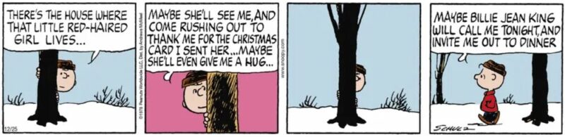 THERE'S THE HOUSE WHERE THAT LITTLE RED-HAIRED GIRL LIVES... あそこが、あの「赤毛の女の子」が住んでいる家だ……。 MAYBE SHE'LL SEE ME, AND COME RUSHING OUT TO THANK ME FOR THE CHRISTMAS CARD I SENT HER... MAYBE SHE'LL EVEN GIVE ME A HUG... もしかしたら彼女が僕を見つけて、送ったクリスマスカードのお礼を言いに駆け寄ってきてくれるかも……。もしかしたら、ハグだってしてくれるかもしれない……。 MAYBE BILLIE JEAN KING WILL CALL ME TONIGHT, AND INVITE ME OUT TO DINNER もしかしたら今夜、ビリー・ジーン・キングが僕に電話をくれて、夕食に誘ってくれるかも。