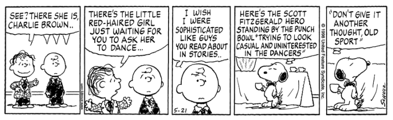 SEE? THERE SHE IS, CHARLIE BROWN.. ほら、彼女があそこにいるよ、チャーリー・ブラウン……。 THERE'S THE LITTLE RED-HAIRED GIRL JUST WAITING FOR YOU TO ASK HER TO DANCE... 「赤毛の女の子」が、君がダンスに誘ってくれるのを待っているよ……。 I WISH I WERE SOPHISTICATED LIKE GUYS YOU READ ABOUT IN STORIES.. 物語に出てくる男たちみたいに、洗練された人間だったらよかったのになあ……。 HERE'S THE SCOTT FITZGERALD HERO STANDING BY THE PUNCH BOWL "TRYING TO LOOK CASUAL AND UNINTERESTED IN THE DANCERS" ここに、パンチボウルの脇に立つスコット・フィッツジェラルド作品の主人公がいる。「踊っている人たちには無関心を装い、さりげなく振る舞おうとしている」のだ。 "DON'T GIVE IT ANOTHER THOUGHT, OLD SPORT" 「気にするなよ、親友(オールド・スポート)」