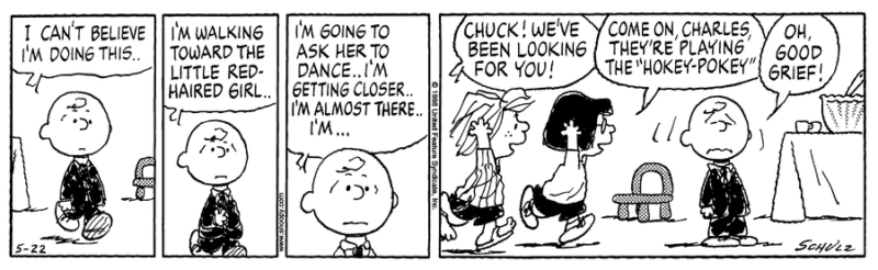 I CAN'T BELIEVE I'M DOING THIS.. 自分がこんなこと(誘いに行くこと)をしてるなんて信じられないよ……。 I'M WALKING TOWARD THE LITTLE RED-HAIRED GIRL.. 僕は今、「赤毛の女の子」の方に向かって歩いているんだ……。 I'M GOING TO ASK HER TO DANCE... I'M GETTING CLOSER... I'M ALMOST THERE... I'M... 彼女をダンスに誘うんだ……。近づいてるぞ……。もうすぐそこだ……。僕は……。 CHUCK! WE'VE BEEN LOOKING FOR YOU! チャック!あんたを探してたんだよ! COME ON, CHARLES, THEY'RE PLAYING THE "HOKEY-POKEY" 来てください、チャールズ。「ホーキー・ポーキー」が始まりますよ。 OH, GOOD GRIEF! やれやれ、なんてこった!