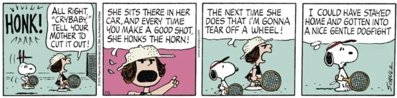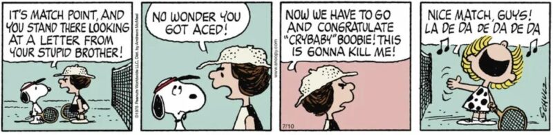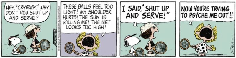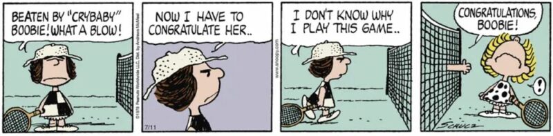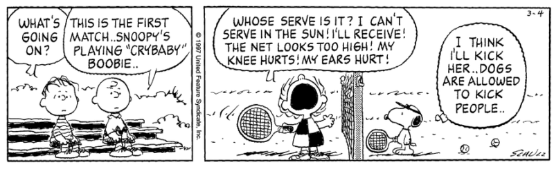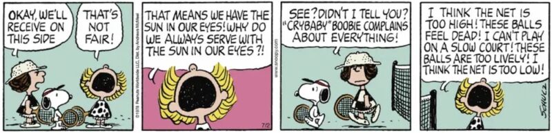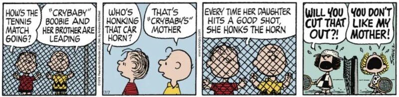その筆頭格とも言えるのが、今回スポットを当てるテニス界の「泣き言の女王」 ピーナッツの名脇役「クライベイビー」ブービー(”Crybaby” Boobie)です。