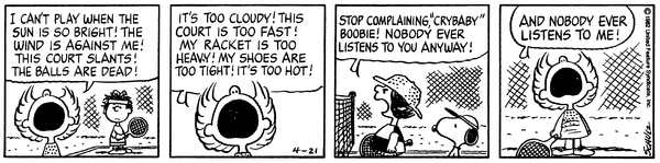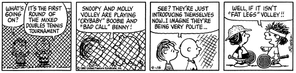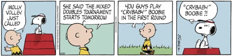 チャーリー・ブラウン「モリー、電話があったよ。混合ダブルスのトーナメントが明日から始まるって」 チャーリー・ブラウン「君たちの初戦の相手は、“泣き虫”ブービーだ」 スヌーピー「『泣き虫』ブービー?!」