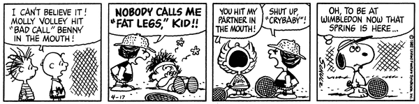 チャーリー・ブラウン「スヌーピーとモリー・ボレーが、『泣き虫』ブービーと『誤審(バッドコール)』ベニーと対戦してるんだ!」