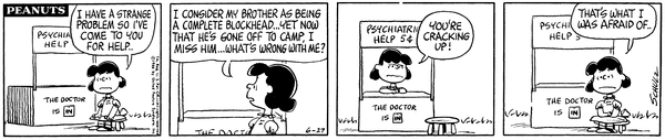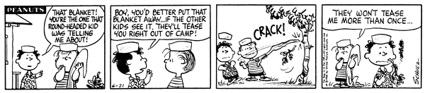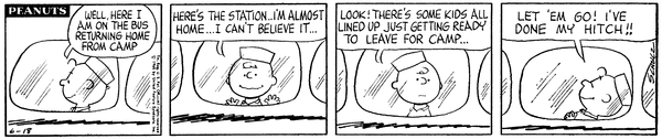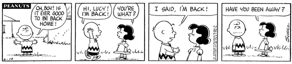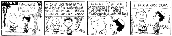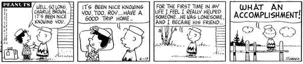 チャーリー・ブラウンがロイを励ましながら成長し、達成感を感じて帰ってきたのに、最後はルーシーにいつも通りあしらわれてしまうのが、いかにも『ピーナッツ』らしい結末ですね。