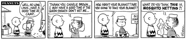 ライナス「キャンプっていうのはいつも森の中にあって、そこにはクイーンヘビがいっぱいいるんだ!君はクイーンヘビに噛まれたことがあるのかい?」