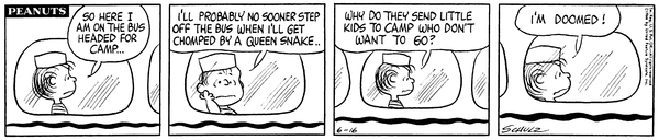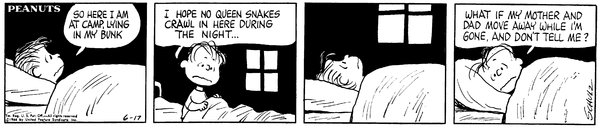 ライナスもチャーリー・ブラウンに負けず劣らず、不安いっぱいのキャンプの幕開けですね。特に「クイーンヘビ」への恐怖が凄まじいです。