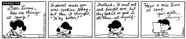 手紙の内容「親愛なるチャーリー・ブラウンへ…キャンプは楽しんでるかい?きっと野球チームの心配をしてるんだろうけど…」
