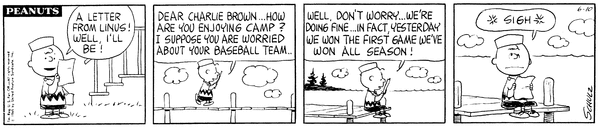 飼い犬のスヌーピーにはさよならを居眠りされ、親友のライナスは手紙でチャーリーブラウンがいない野球チームで勝利報告をしています!もしや…チャーリーブラウンがいない方が勝率がいいの?