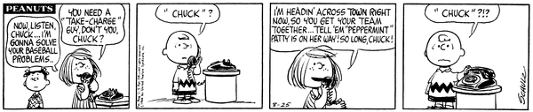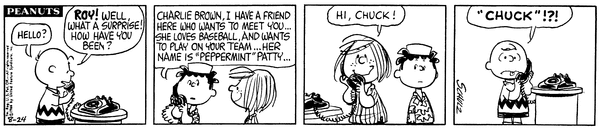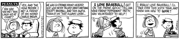ロイ「チャーリー・ブラウン、君に会いたがってる友だちがここにいるんだ…彼女は野球が大好きで、君のチームでプレーしたいって…名前は“ペパーミント”パティ…」