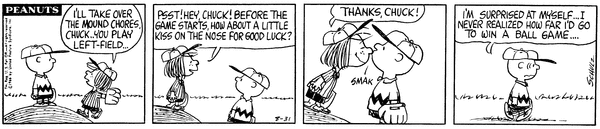 チャーリーブラウンは試合に勝つためなら、ピッチャーを交代し、キスもしちゃうのね…そんな自分にビックリしている様子ですね。押しの強い女の子に弱い典型的な男の子みたい!