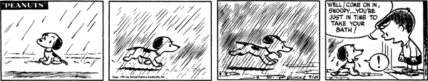 雨の中をスヌーピーが走ってきて、ある家に入っていきます。